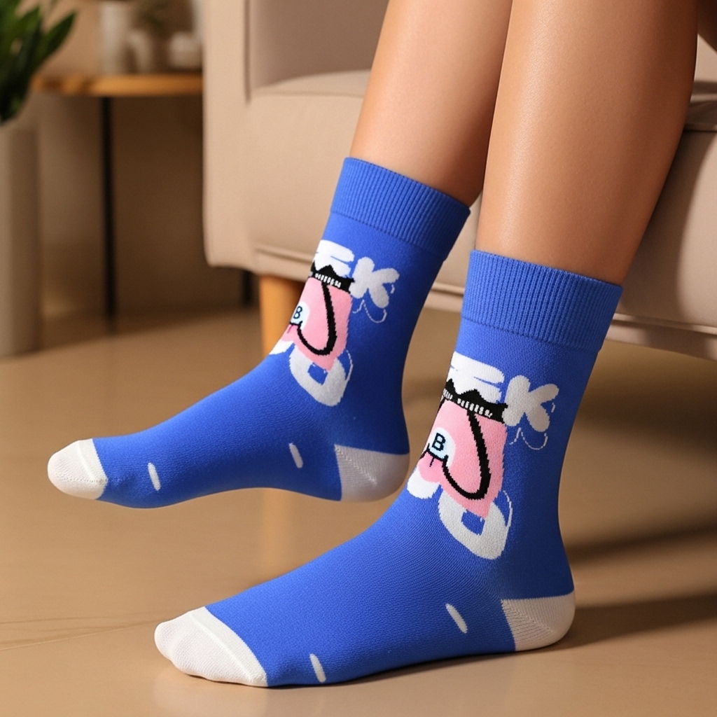 Add a quirky twist to your sock collection with these blue crew socks featuring a cheerful cartoon character print. Made from a soft cotton blend, these socks provide all-day comfort while letting you showcase your fun personality.