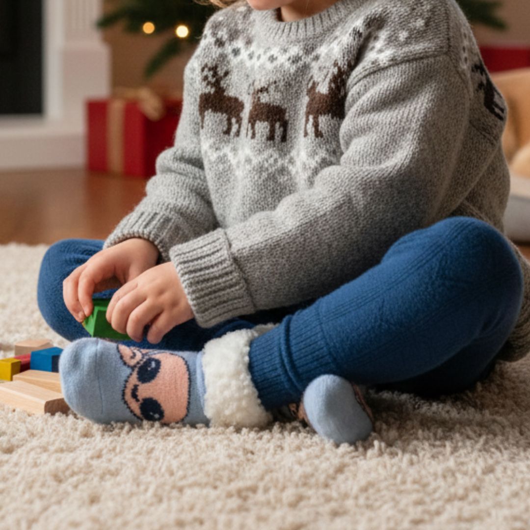 The soothing blue colour paired with a cute face design makes these socks fun and attractive for kids. The thick white fur cuff adds extra insulation around the ankles, helping to retain heat and ensuring a snug, comfortable fit without slipping.