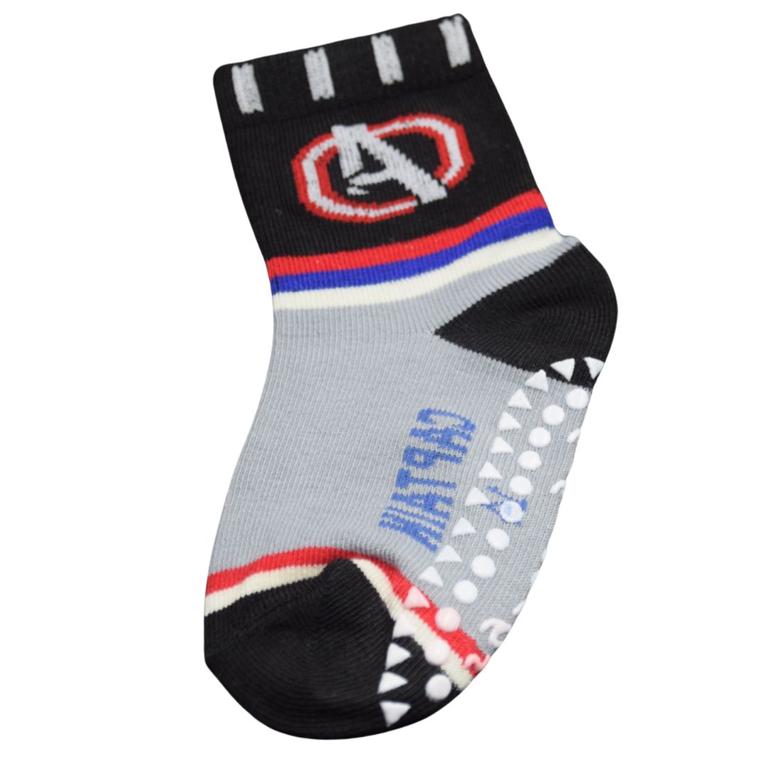 Engineered for stability and designed for heroic action, these striking anti-slip grip socks are the ultimate gear for every young fan, expertly combining the flexible comfort of a high-quality cotton blend sock with the crucial safety of indoor footwear, making them indispensable for homes with slippery hardwood, tile, or laminate floors where accidental slips often occur. The sock features a dynamic, multi-section aesthetic with a soft grey body, a bold black cuff displaying the iconic red and blue Avengers ‘A’ logo, and red accents on the toe and heel, immediately inspiring imaginative play and fueling hours of action-packed fun while the ribbed cuff ensures a secure fit. The functional excellence of this design is maximized by the application of durable, non-toxic silicone grips covering the entire sole, which ensure unparalleled, multi-directional traction, effectively preventing slips and minimizing the risk of falls during running, jumping, and balancing on smooth surfaces, providing parents with essential peace of mind. Furthermore, the material is a soft, breathable cotton blend that is gentle on sensitive skin, keeping active feet cool and dry, while the reinforced construction ensures the sock maintains a secure, comfortable fit that stays put through hours of unstoppable play, making them an indispensable, high-quality accessory for daycare, playrooms, and everyday safety;