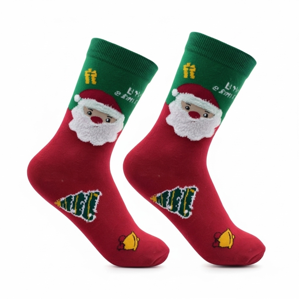 Add a cheerful touch to your holiday outfits with these Christmas Santa Claus Crew Socks. Designed with a bright red base, green cuffs, and adorable Santa, Christmas tree, and bell patterns, these socks bring festive vibes wherever you go. Crafted from soft, breathable, and durable fabric, they provide all-day comfort while keeping your feet cozy in the winter season. Perfect for Christmas parties, lounging at home, or as a thoughtful holiday gift, these socks are a must-have for spreading Christmas joy.