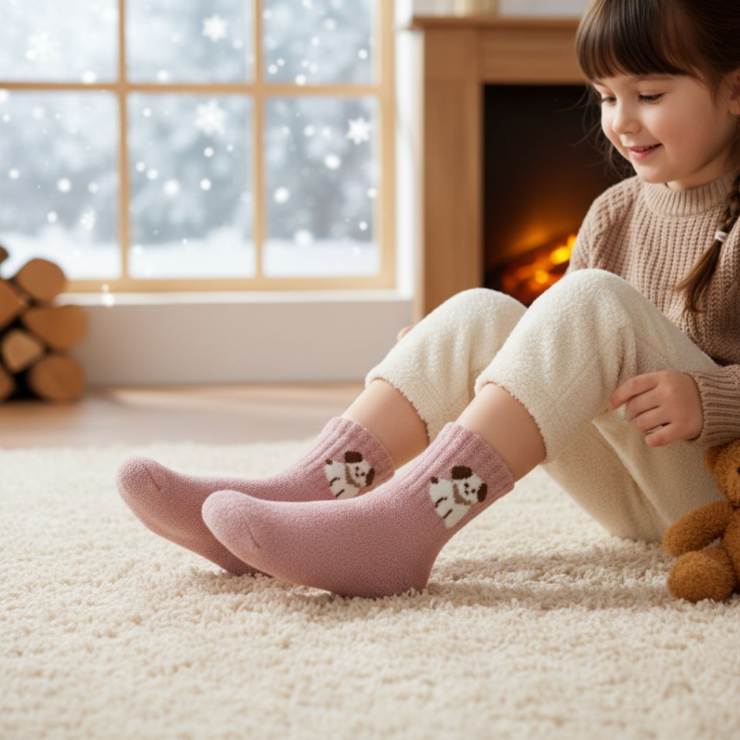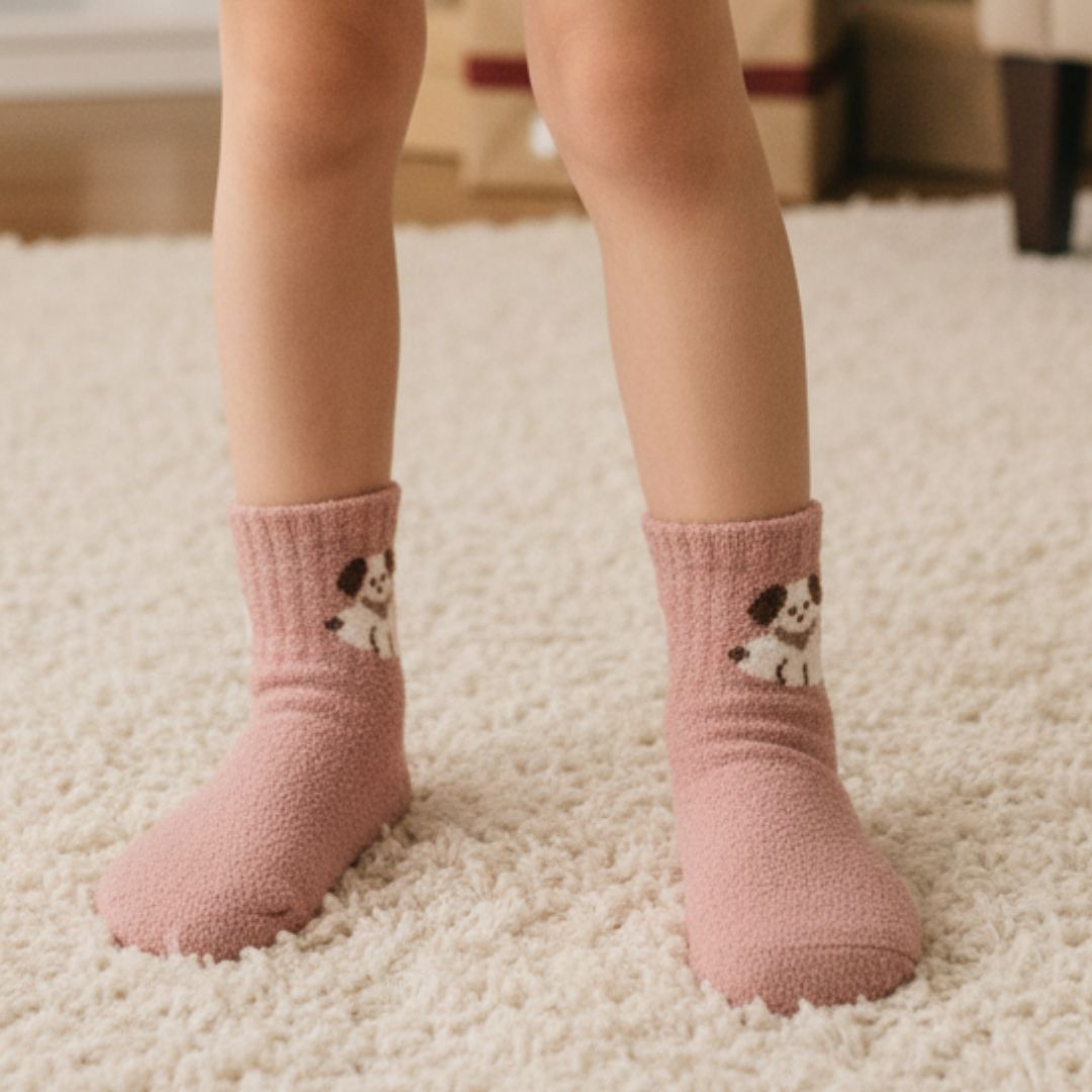 As requested, here is a detailed description of these cozy essentials. These premium winter socks are the ultimate solution for keeping your child’s feet toasty and comfortable during the chilly winter months. Made from high-density, cloud-like fleece material, they offer a luxurious touch that feels gentle against sensitive skin while providing a thick layer of insulation against cold indoor floors. The charming dusty rose color is beautifully accented by a whimsical puppy motif, making them a favorite for kids who love cute characters. Whether your little one is curled up by the fireplace, playing on the rug, or heading off to bed, these socks provide the perfect blend of breathable warmth and adorable style.