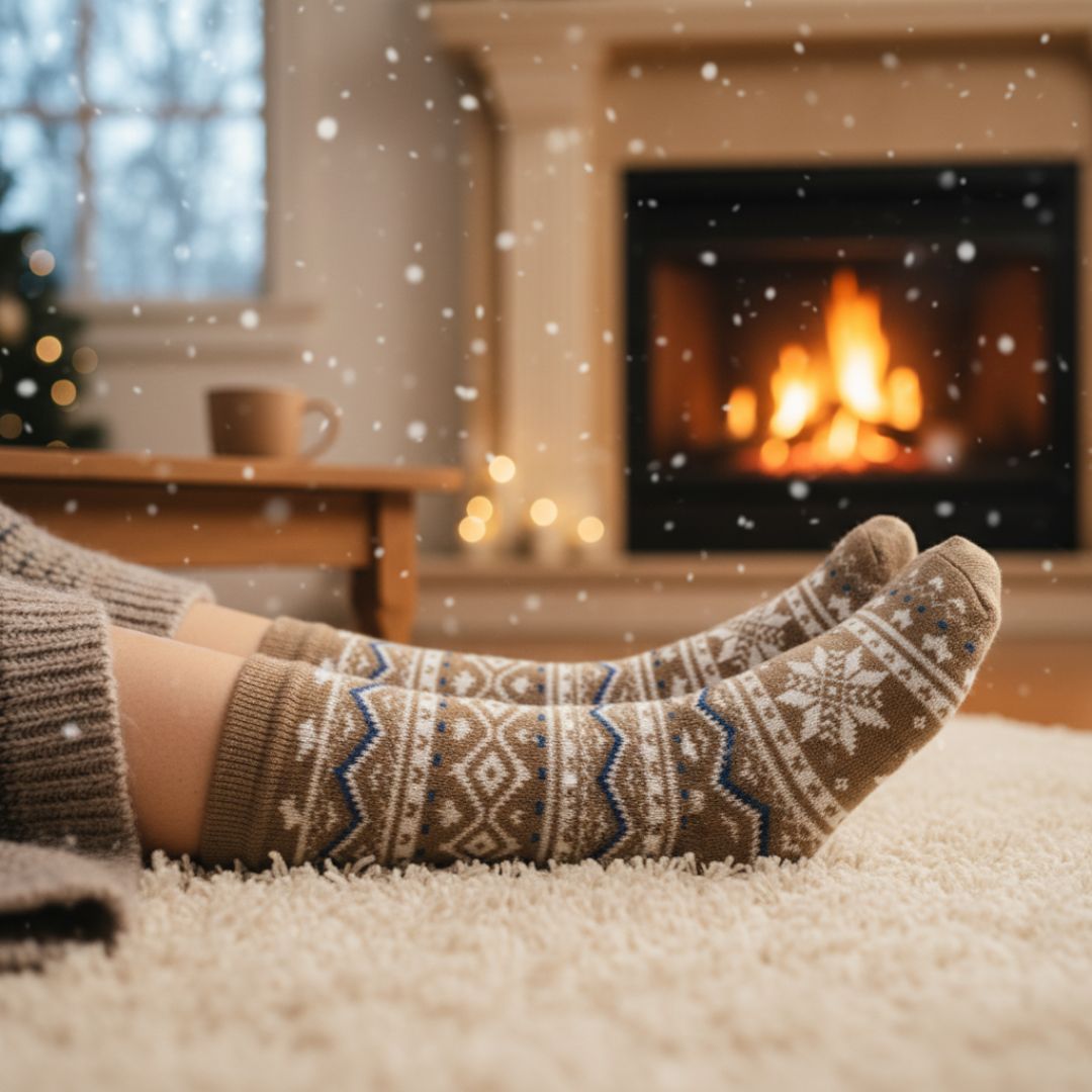 Luxury Home Comfort: Designed as soft and insulating unisex thermal socks, they are perfect for wearing on cold floors or curled up by the fireplace, as seen in the cabin setting.