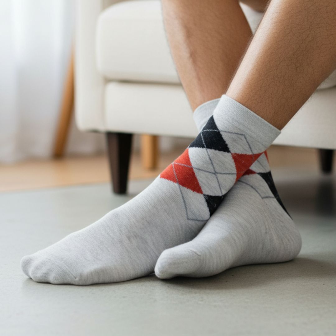 These Light Grey Cotton Ankle-Length Socks are made from breathable, skin-friendly cotton for all-day comfort. Designed for normal and casual wear, they feature a modern argyle pattern with subtle contrast tones that add a clean, stylish look. The ankle-length fit makes them easy to pair with sneakers, loafers, or daily footwear. Lightweight and non-woolen, these socks are ideal for regular use and mild weather conditions.