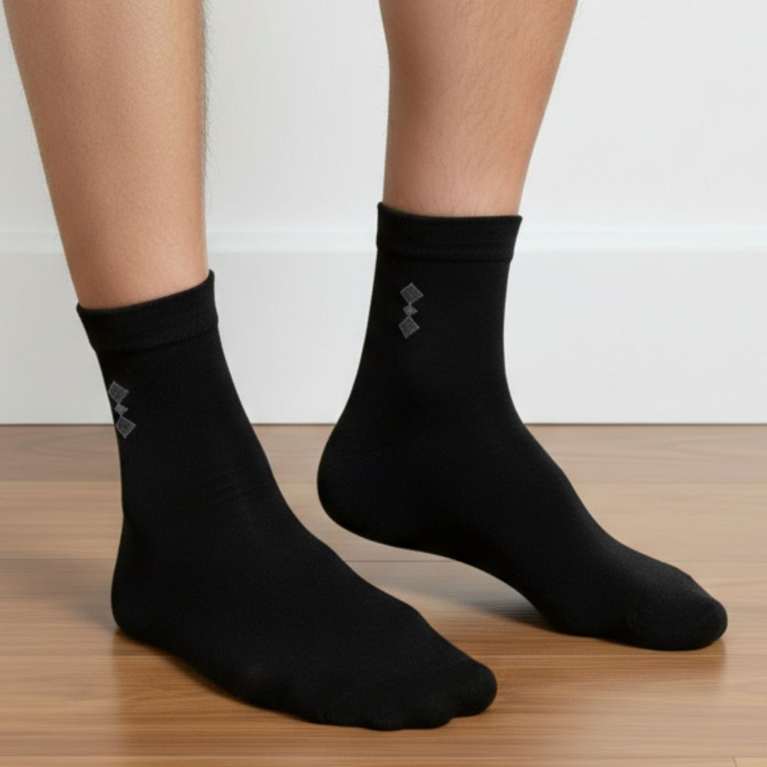 These men’s cotton ankle socks are crafted from soft and breathable fabric to keep your feet comfortable throughout the day. The ankle-length design gives a neat and modern look while providing a snug, supportive fit. The smooth texture feels gentle on the skin and offers good stretch, helping the socks stay in place without slipping or feeling tight. The classic black color with subtle detailing makes these socks easy to pair with formal shoes, sneakers, or casual footwear, making them a versatile choice for daily wear.