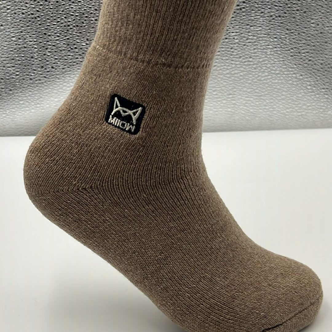 The elegant brown color and minimal embroidered Miow logo add a classy touch, while the ribbed cuffs ensure a secure, non-slip fit. Whether you’re lounging at home, heading to work, or layering up for outdoor walks, these socks provide warmth and elegance in every step.