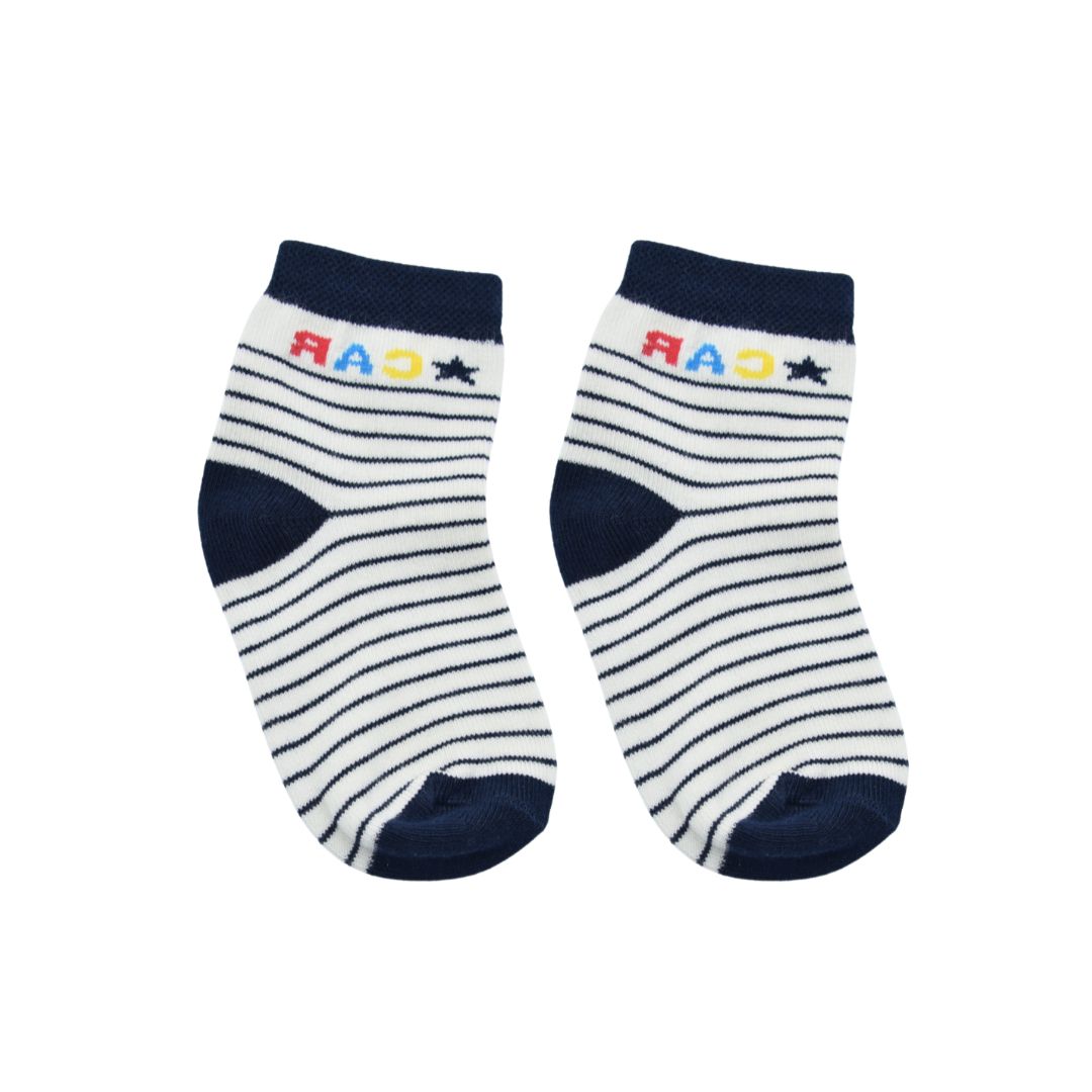 Add a playful touch to your baby’s wardrobe with these Navy Blue & White Striped Baby Socks. Featuring a cheerful “CAR” design at the cuff in bright, colorful letters, these socks combine comfort and cuteness effortlessly. Made from a soft, breathable cotton blend, they are gentle on delicate skin and offer a snug, stretchable fit to keep your baby’s feet cozy. The contrasting navy heel, toe, and cuff add durability and a stylish finish, making these socks perfect for everyday wear, outings, or gifting.