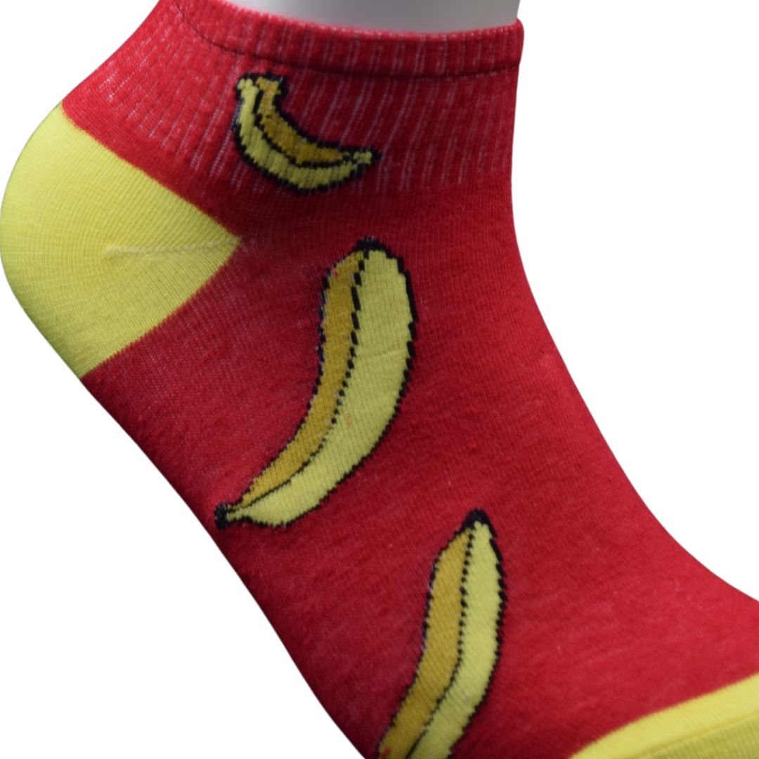 Make a statement with our Red Banana Print Ankle Socks, designed to add a splash of color and personality to your everyday style. The vibrant red base is decorated with playful yellow banana graphics, while the yellow heel and toe create a fun contrast that makes these socks truly stand out.