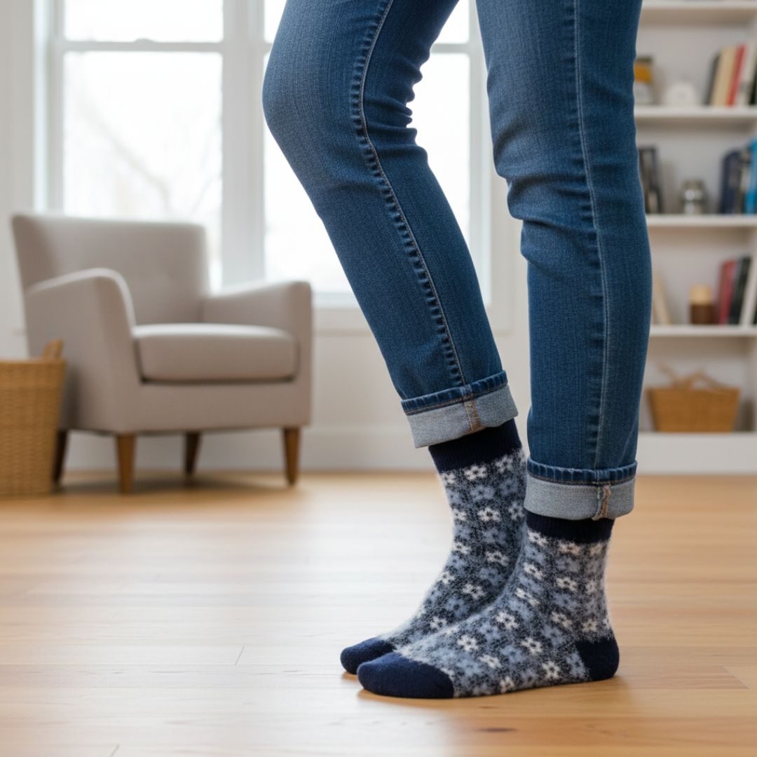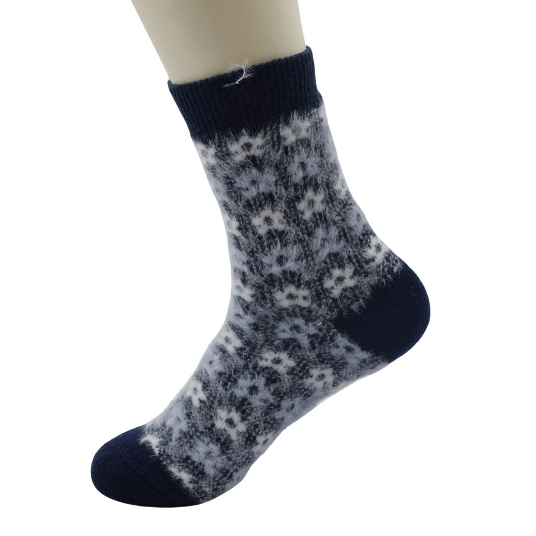 The exterior displays a timeless Fair Isle or Nordic pattern in a sophisticated mix of light blue, heather grey, and white, set against a darker blue base. The toes, heel, and cuff are finished in a solid Navy Blue for durability and structure. The crew height is perfect for wearing with boots, and the plush, non-irritating material makes them ideal for cozy nights relaxing at home.