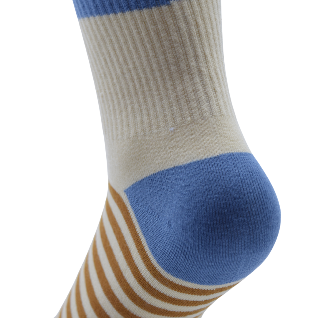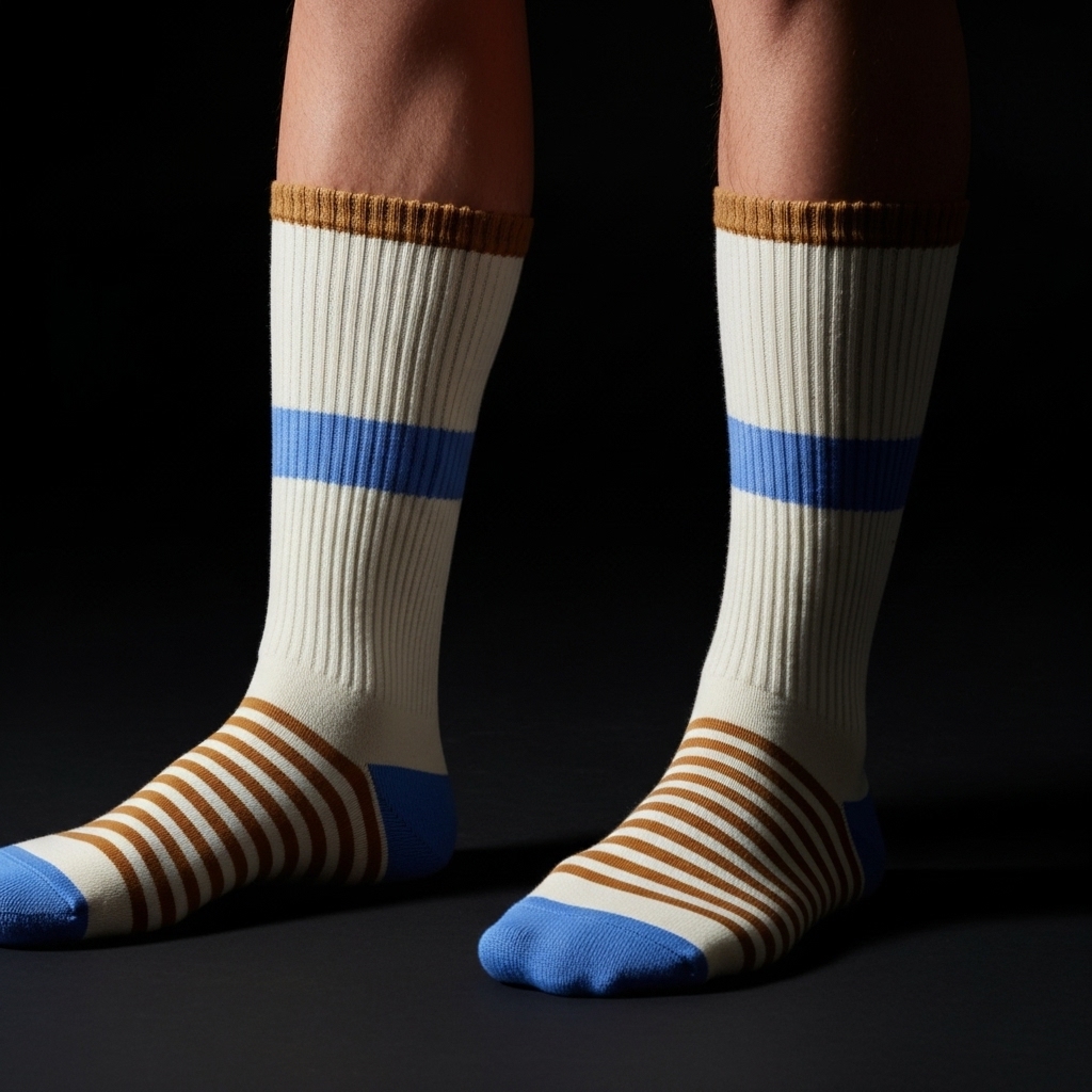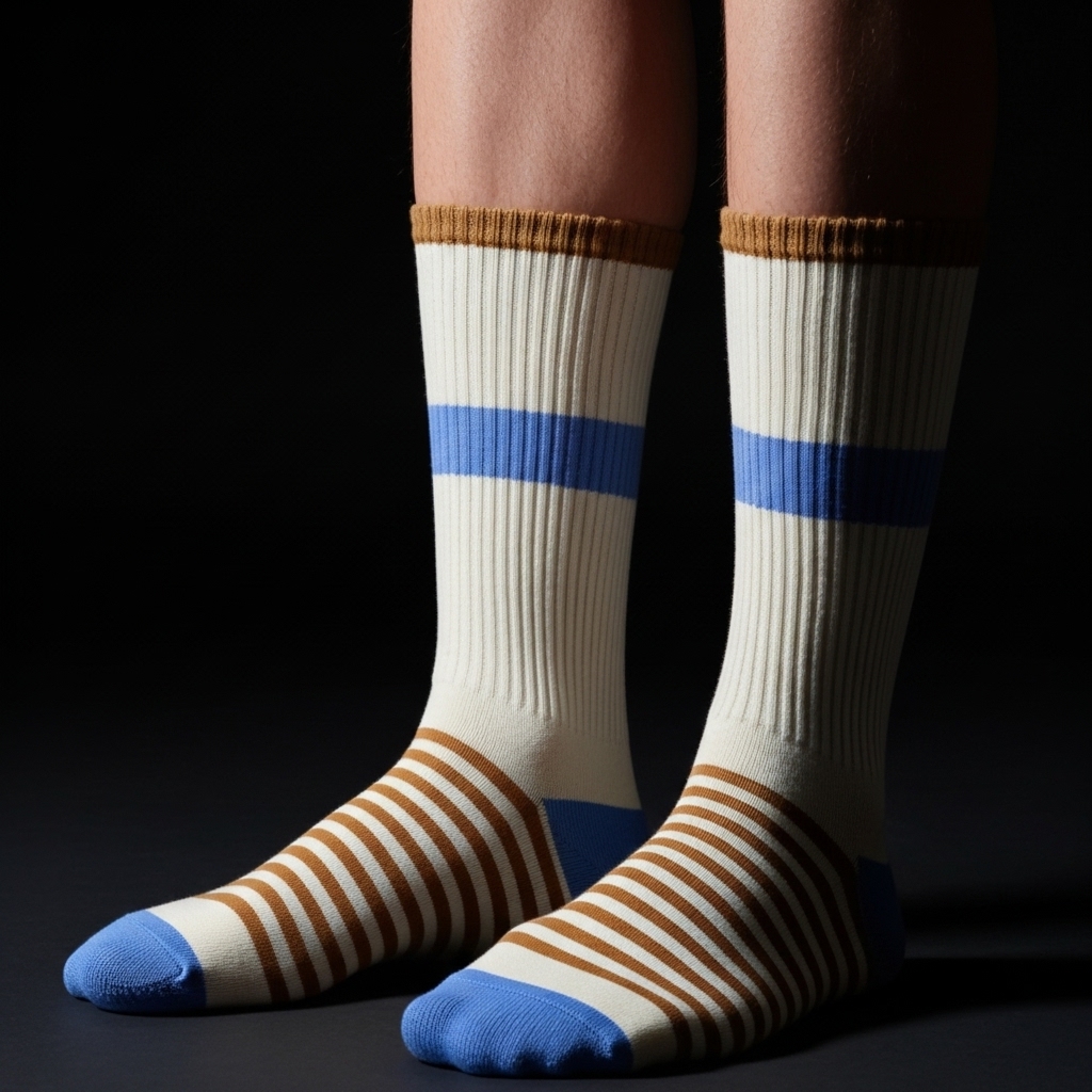 With a cream beige base, bold blue highlights, and classic brown stripes, this pair offers a unique yet versatile design that complements both casual and semi-formal outfits. The ribbed cuff ensures a secure fit, while the reinforced heel and toe provide added comfort and durability.