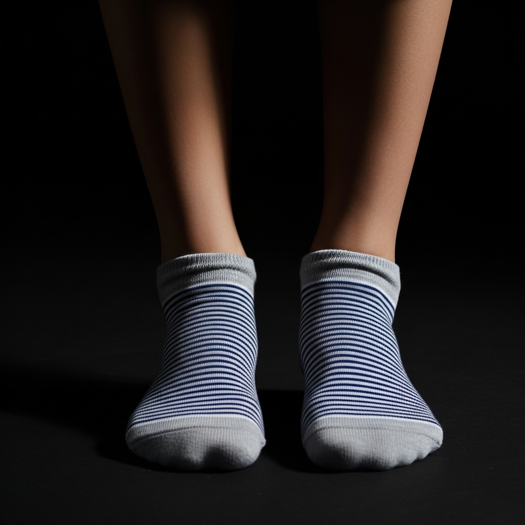 Step into everyday comfort with these unisex low-cut ankle socks, designed for both style and functionality. Made with a soft and breathable fabric blend, these socks keep your feet cool, dry, and comfortable throughout the day. The versatile light grey base is accented with classic navy blue stripes, adding a timeless touch that pairs well with sneakers, casual shoes, or even lounging at home.