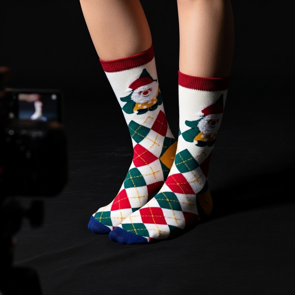 The classic argyle design is refreshed with vibrant holiday colors: rich red, deep forest green, warm mustard yellow, and crisp white, accented with subtle blue toes and red cuffs. This blend of traditional style and playful holiday motifs makes these socks a unique and charming addition to any Christmas ensemble.