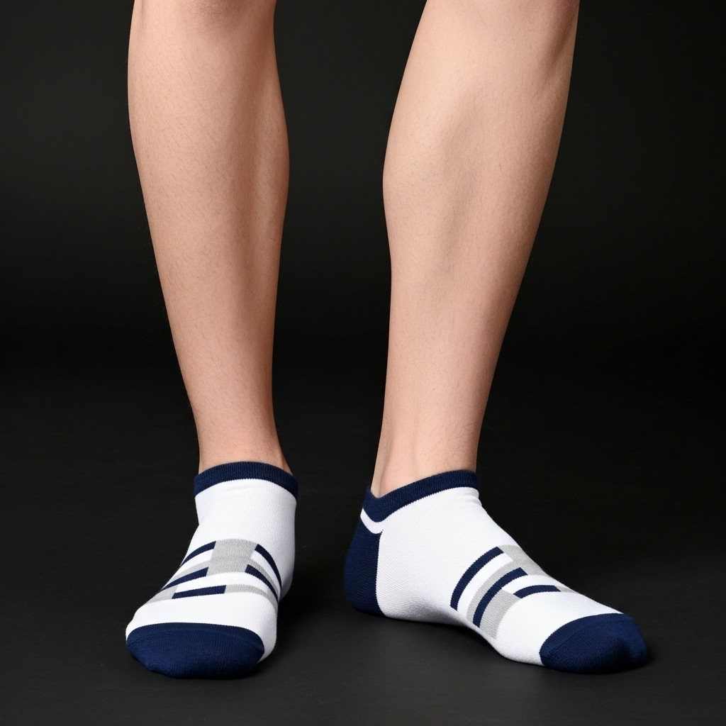 Add a fresh and sporty touch to your essentials with our White Sporty Low-Cut Socks. Designed with a clean white base and accented by bold navy and grey stripes, these socks strike the perfect balance between casual style and everyday comfort.