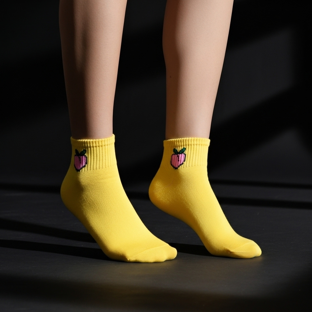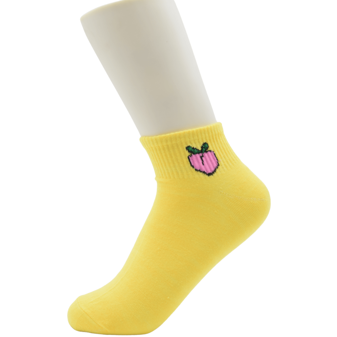 The vibrant yellow base paired with the cute pink peach embroidery makes these socks stand out, whether you’re at home, in sneakers, or showing off your quirky style outdoors. Perfect for fruit lovers or anyone who enjoys fun fashion, these socks are a must-have addition to your collection.
